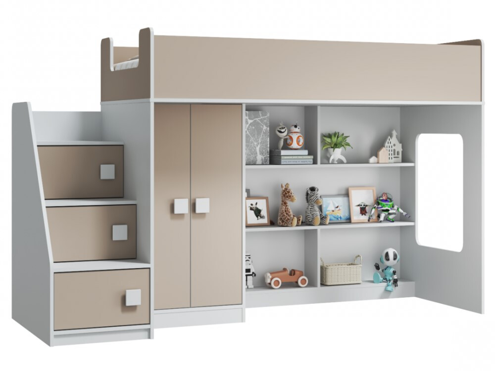 "ТЕМА-7" Кровать-чердак шкаф прямой (с лестницей торцевой) белый/капучино