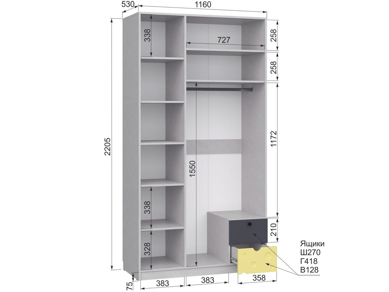 Габаритные размеры (ВхШхГ): 2205 х 1160 х 530 мм